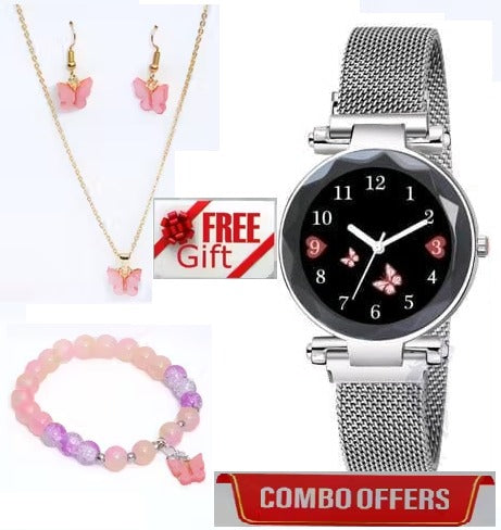 Women’s Butterfly Design Analog Watch with Bracelet, Necklace & Earrings